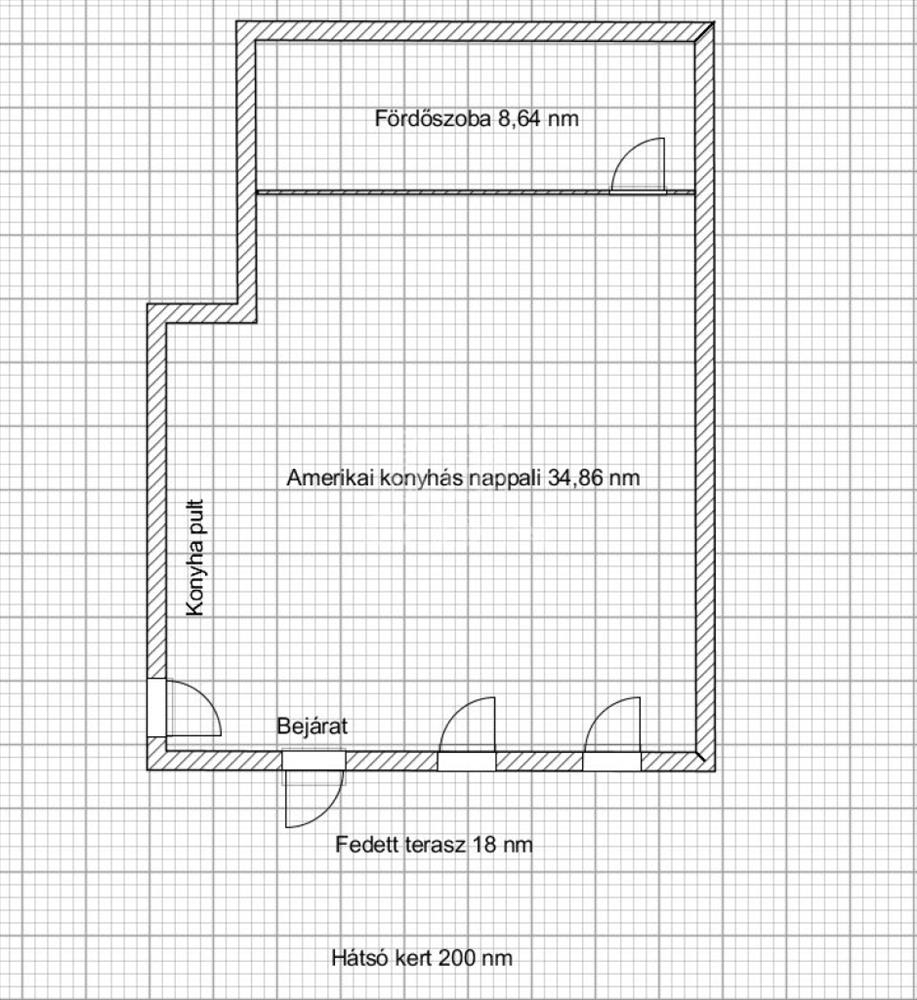 Alapterülete 44 nm, jelenleg 1 nagy szobás, amerikai konyhás elosztású, de könnyedén 1, 5-2 szobássá alakítható több féle alaprajzi lehetőséggel.