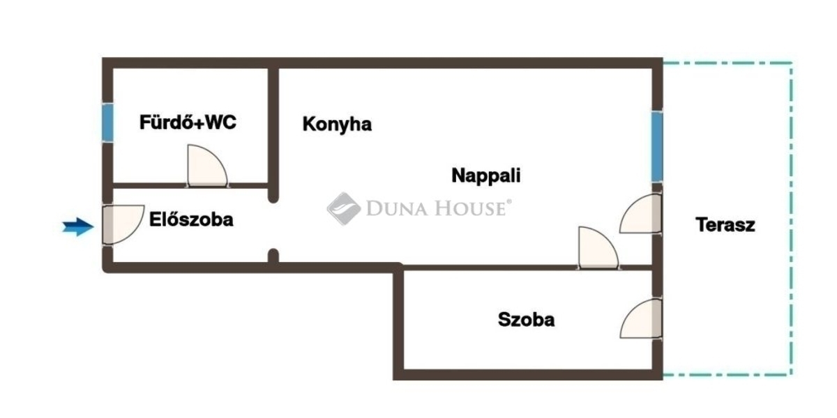 Belépés után az előszobában találjuk magunkat, ahonnan balra a kádas, ablakos fürdőszoba található. a bejárattal szemben a tágas, világos amerikai konyhás nappali helyezkedik el, amelyből eljuthatunk a nagyjából 10 nm -es hálószobába, valamint a teraszra és a saját használatú kertünkbe is.