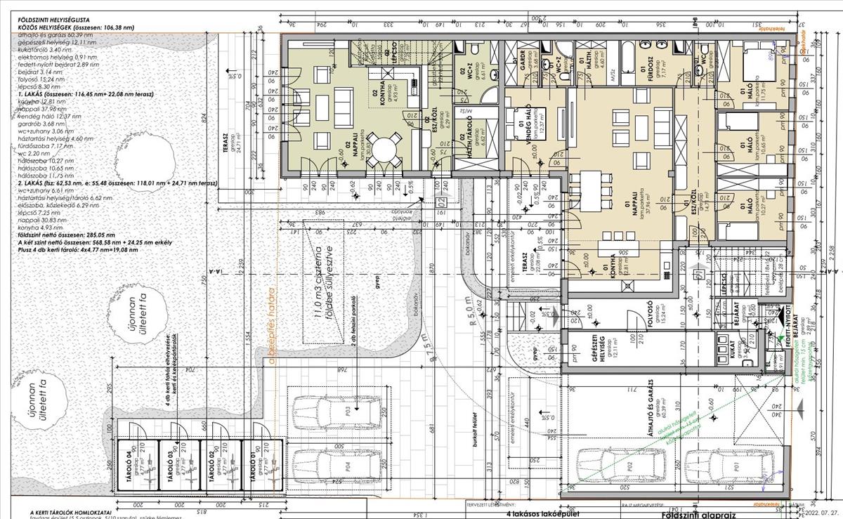 A földszinten a garázsokon kívül 4 tároló, szemetestároló, gépészeti és elektromos helyiség kap helyet.