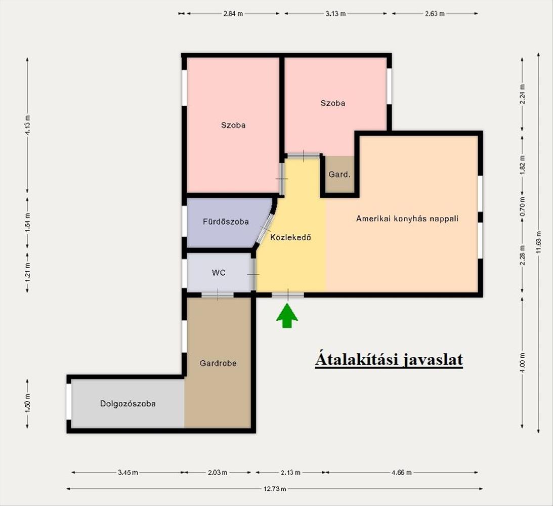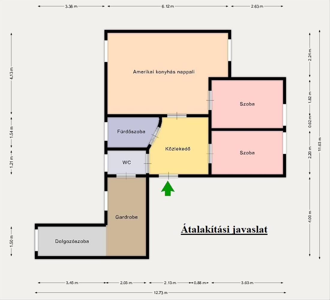 A mellékelt átalakítási terv alapján a lakás könnyedén amerikai konyhás nappali + 2 hálószobás elrendezésűvé alakítható, így kiváló választás családoknak, fiatal pároknak vagy befektetőknek is.