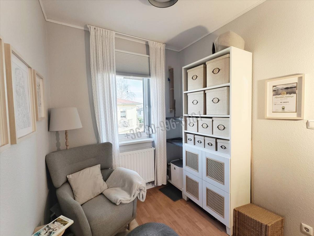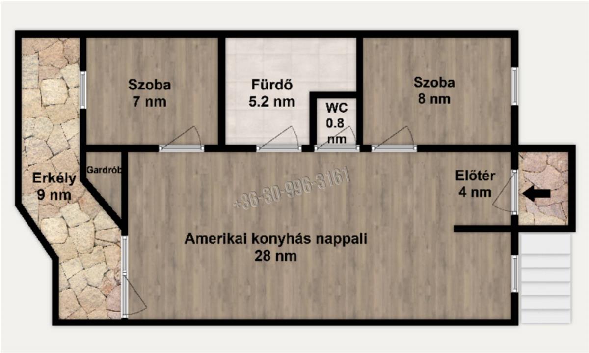 A ingatlan egy saját külső lépcsőn keresztül közelíthető meg. Nagyon jó elosztású, belépve egy kisebb előtér fogad, majd rögtön elénk tárul a 28 nm-es amerikai konyhás nappali melyben a beépített igényes konyhabútor sütővel, főzőlappal, elszívóval és mosogatógéppel az ár részét képezi. Innen léphetünk a 9 nm-es erkélyre mely jól berendezhető, kényelmesen elfér kint egy kisebb teraszbútor és egy-két napágy is. a nappaliból nyílik minden helyiség egymás mellett. a kert felé néz az egyik félszoba, melyben egy sarokrész leválasztásra került és itt egy egy méter mélységű tárolót alakítottak ki Mellette található a sarokkáddal rendelkező fürdő és a wc külön helyiségben. a másik irányba néz a kisebbik félszoba, melyben egy óriási gardróbszekrény segíti a tárolást ami szintén az új tulajdonosra vár.