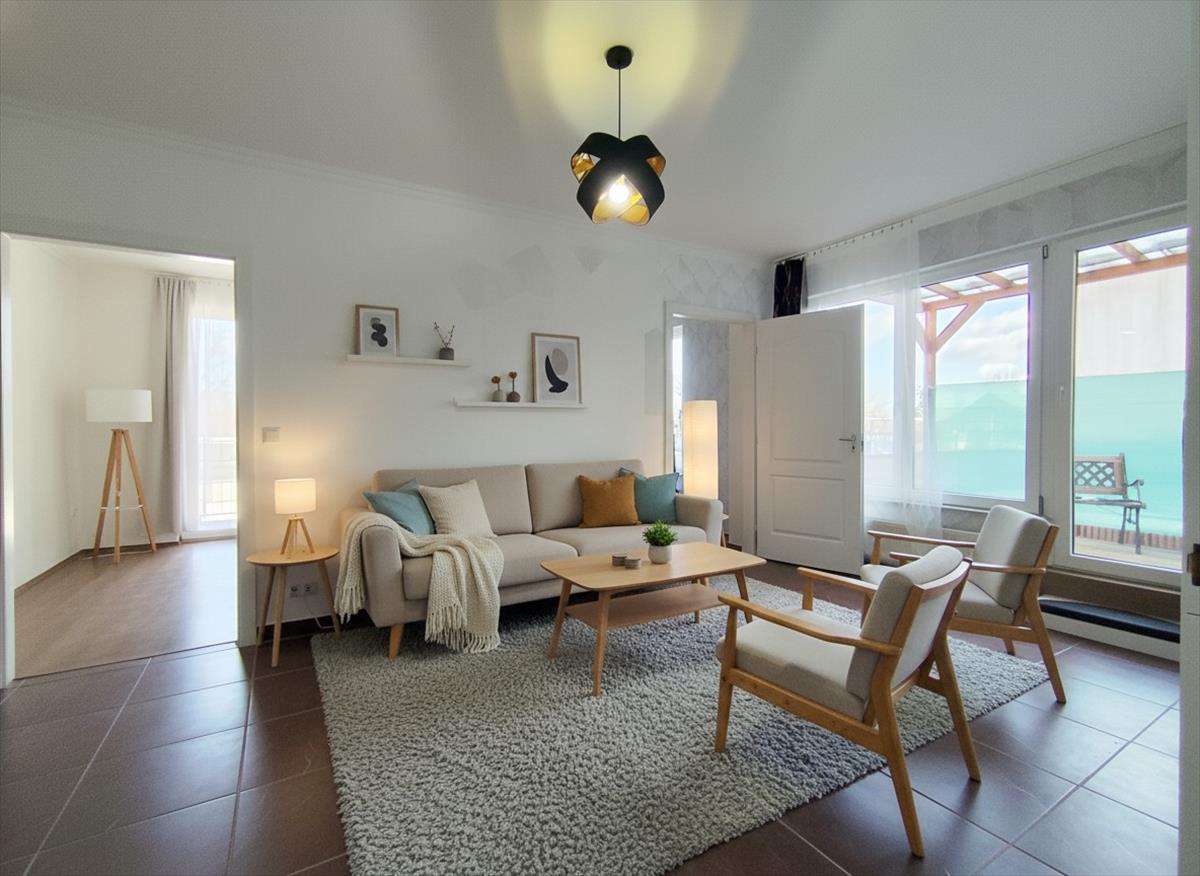 A lakás adottságai, nappali + tetőterasz kapcsolattal, két hálószoba (a nagyobb erkélyes), frissen kifestve így azonnal beköltözhető.