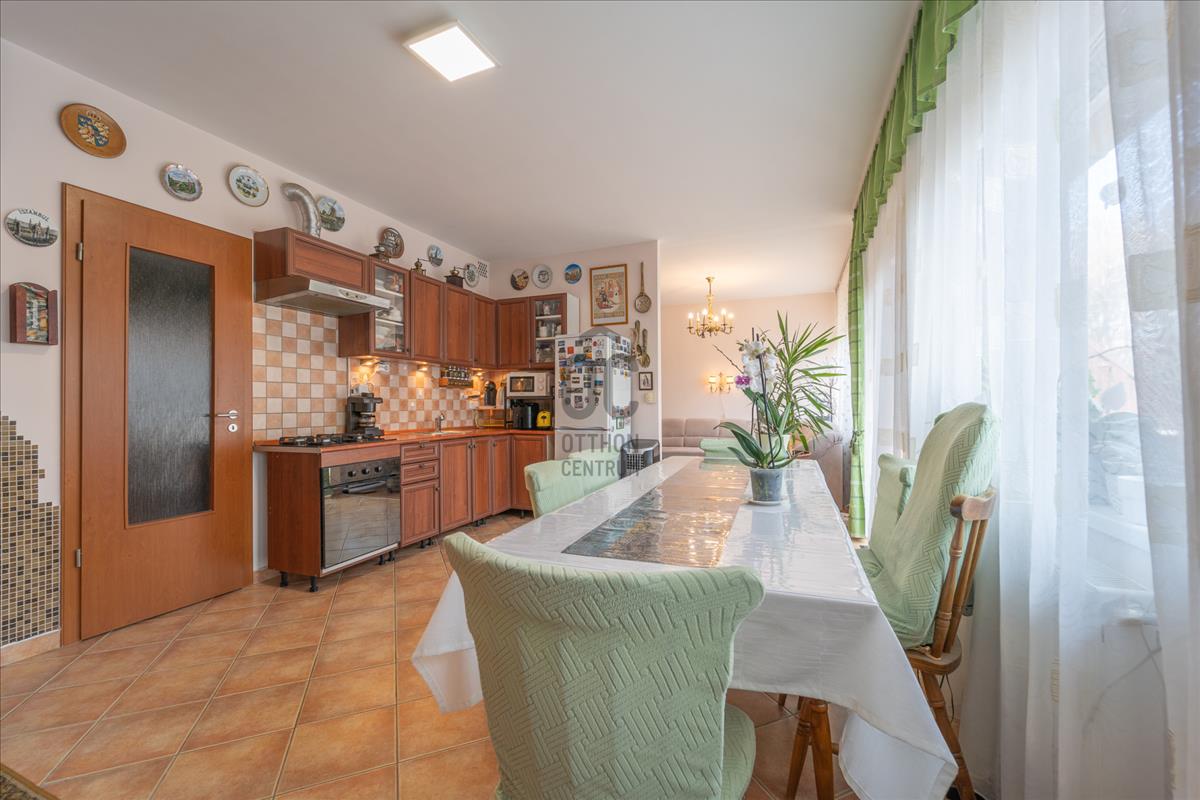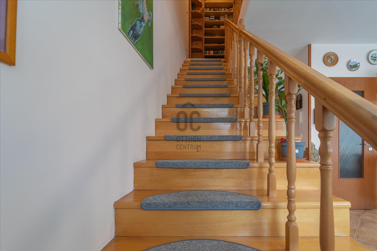 Az alsó szinten egy tágas konyha–étkező, amely kényelmes teret biztosít a mindennapi családi étkezésekhez és a vendégek fogadásához, valamint a nappali kapott helyet,