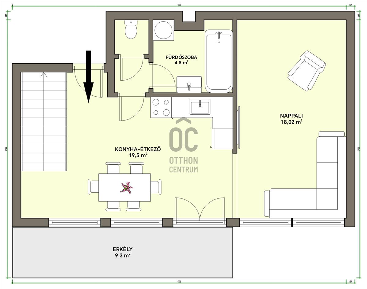 A nappaliból nyílik a 9, 5 m²-es erkély, amely zöld kertre néz, így nyugodt, kellemes környezetet biztosít a pihenéshez vagy akár egy reggeli kávéhoz.