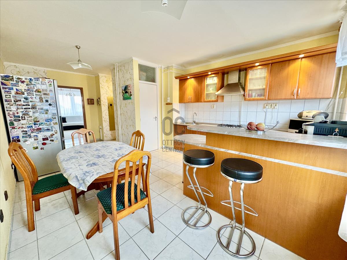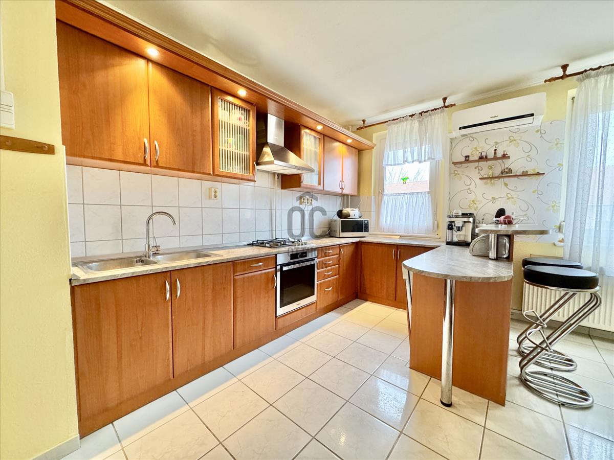 - megújult konyha: oda tervezett konyhabútorokkal, gáztűzhely, sütő, szagelszívó, mosogatógép, rozsdamentes mosogató, hűtőszekrény, bárpult székekkel