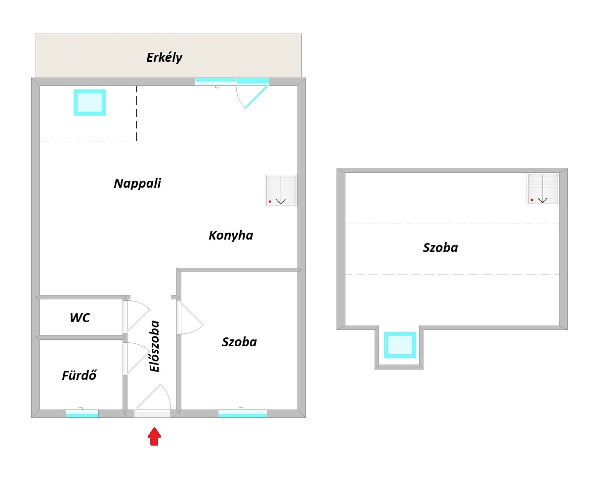 Az ingatlan alsó szintje 48 m² alapterületű, amelyhez egy 5 m²-es erkély kapcsolódik. Az elrendezés praktikus és jól élhető: amerikai konyhás nappali, külön hálószoba, fürdőszoba, külön wc, valamint előszoba került kialakításra. a nappali és az erkély kapcsolata kellemes, világos életteret biztosít, ideális mindennapi pihenéshez.