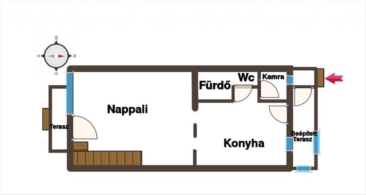 Nappali + étkező: 25, 6 m², innen nyílik a kb. 8 M²-es terasz.