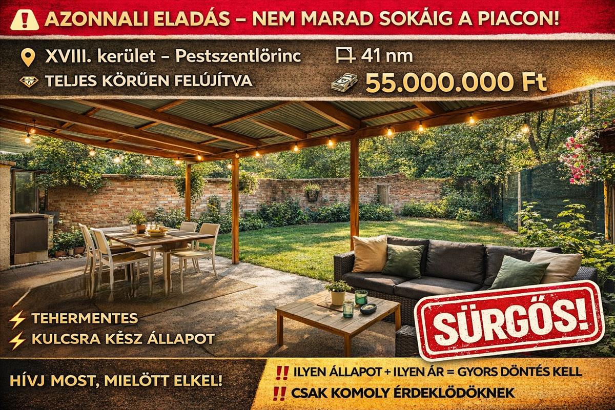 Pestszentlőrinc zöld, családias részén eladó egy 41 nm -es, teljes körűen felújított, kertkapcsolatos otthon fedett terasszal. Becslési áron ALUL!Ideális választás pároknak, első lakásnak vagy akár befektetésnek is.
