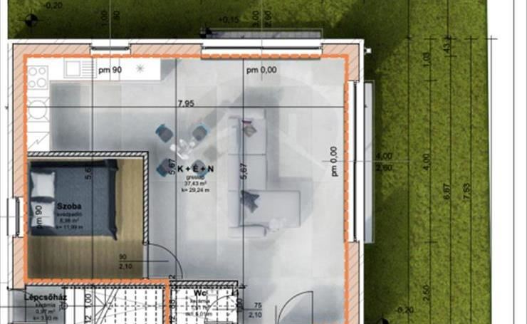 Kiváló elosztás, amerikai konyhás nappali +2 szoba és saját használatú kert.