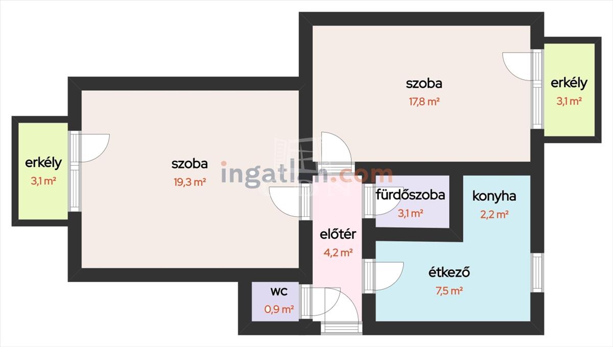 19, 26m2, szoba 17, 81m2, fözőfülke 2, 17m2, étkező 7, 52m2 fürdőszoba 3, 11m2, wc 0, 85m2, előszoba 4, 24m2, erkély 3, 1m2, erkély 3, 1m2;