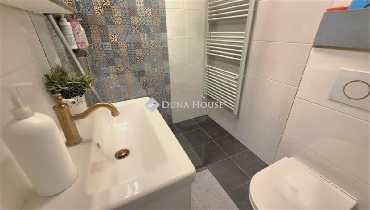 -A fürdőszoba 2022-ben teljes körű felújítást kapott, modern burkolatokkal és elektromos törölközőszárítóval lett felszerelve.