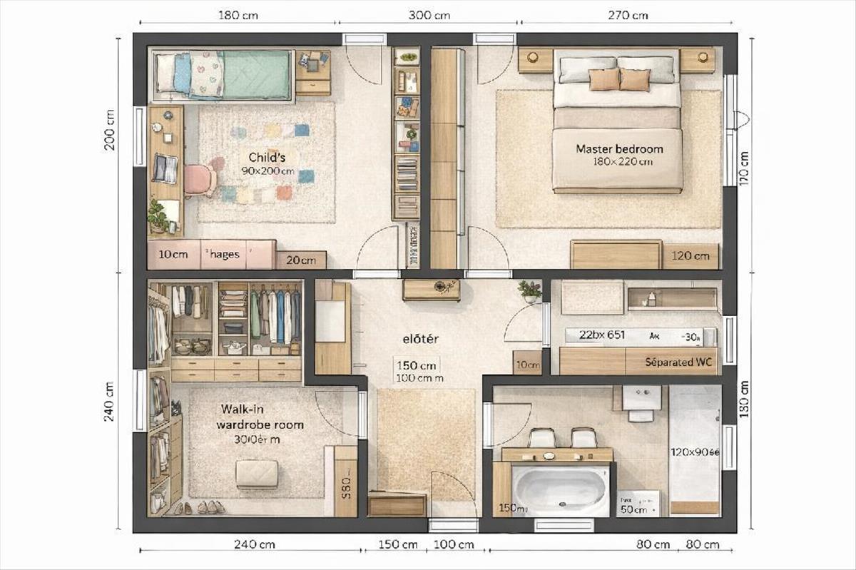 közlekedő, 2 hálószoba, gardrób, fürdőszoba káddal, wc