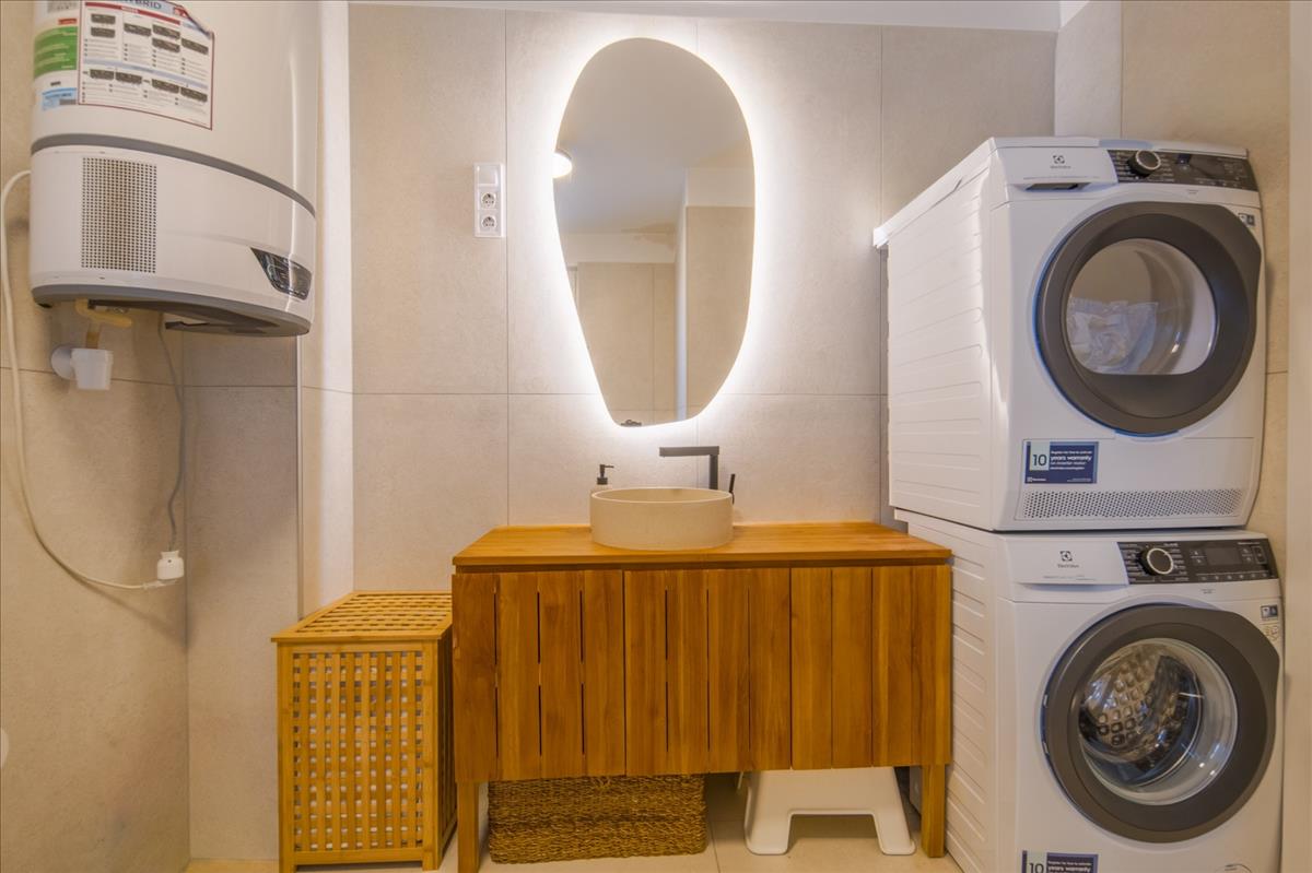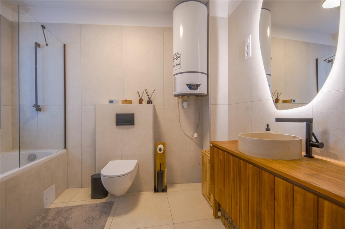 A 7 m2-es fürdőszoba kádas, ablakos, a WC-vel egy helyiségben, a konyhabútor teljesen egyedi építésű, beépített gépekkel együtt az ár részét képezi.