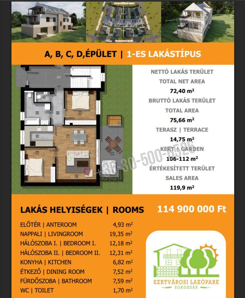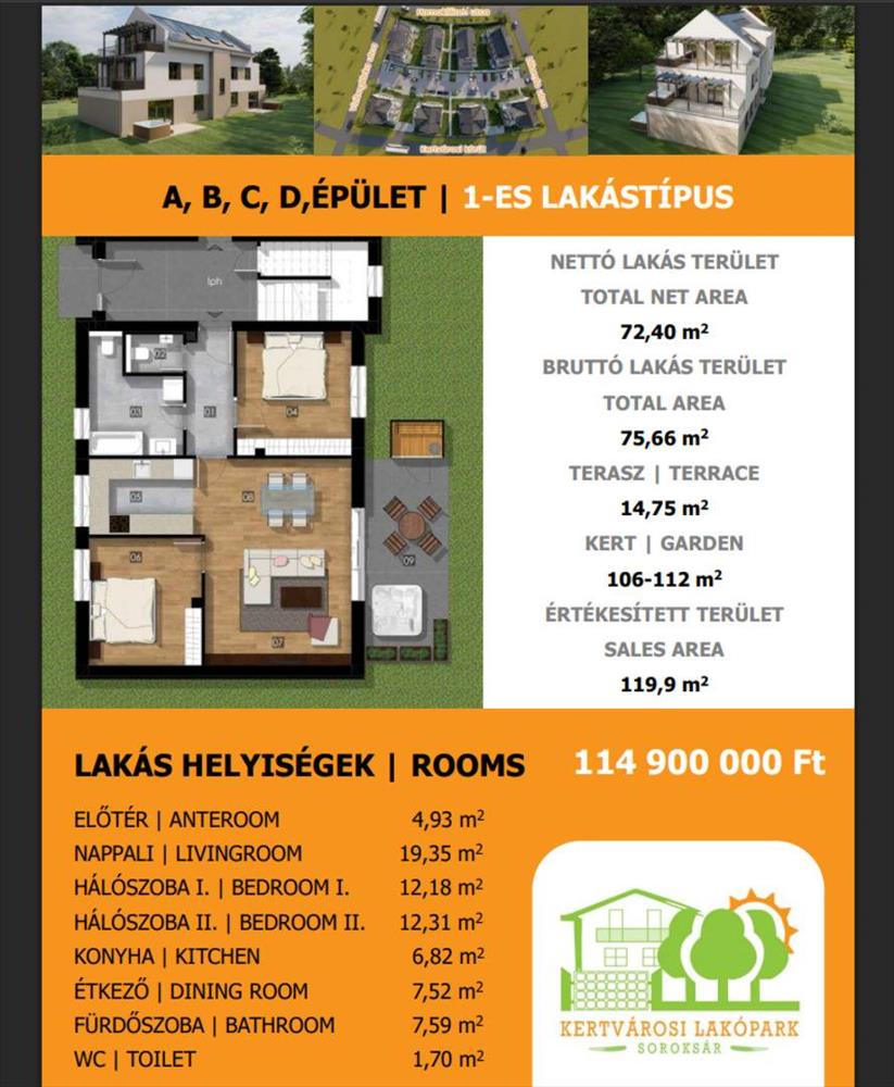 A hirdetésben szereplő földszinti lakástípus nettó 72, 4 m2+ 14, 75 m2 terasz alapterületű, valamint 106-112 m2 privát kert tartozik hozzá.