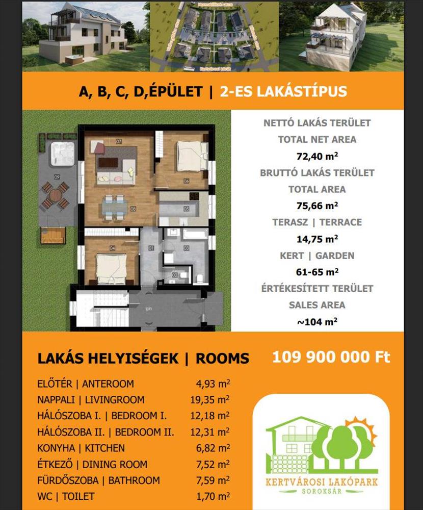 A hirdetésben szereplő lakástípus nettó 72, 4 m2+ 14, 75 m2 terasz alapterületű és 61-65 m2 privát kert tartozik hozzá!