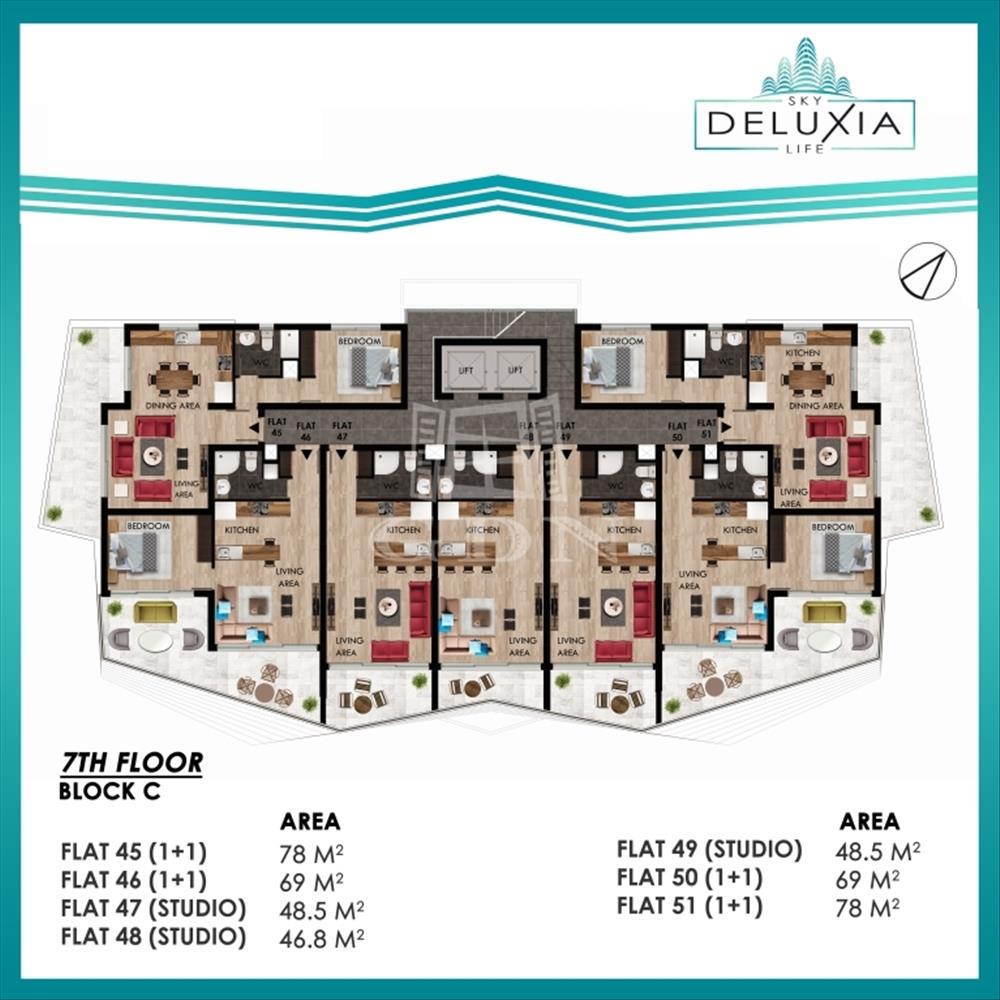 Az Iskelén épülő Sky Deluxia Life projekt keretein belül kínáljuk megvásárlásra, ezt az 'c' épületben található 7. emeleti bruttó 78 nm-es, Nappali+1 hálószobás lakást, amely mind saját használatra, mind bérbeadásra / befektetésre kiváló lehetőség. ( Az alaprajzon flat 45 lakás)