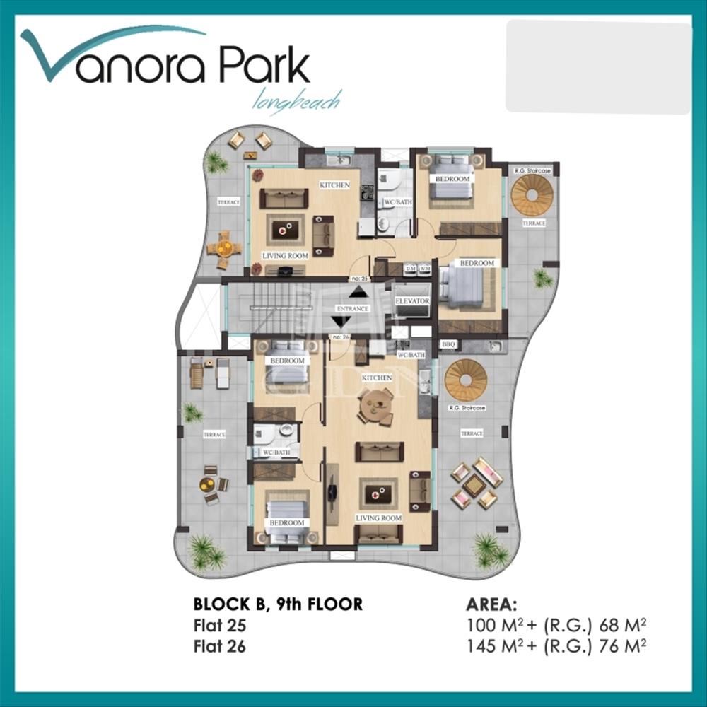 A Vanora Park Long Beach komplexum 180 db 2 és 3 hálószobás apartmant, valamint irodákat és üzletközpontokat foglal magába. Ez a komplexum csendes, nyugodt életet biztosít a természettel összhangban, távol a város nyüzsgésétől, úszómedencékkel, víziparkkal, grillezővel, kerttel, játszótérrel, gyógyfürdővel és szépségszalonnal. További extrák a szauna, fitneszközpont, bárok a medencénél és a teraszon, amelyek lehetővé teszik az élet teljes élvezetét anélkül, hogy elhagyná otthonát.Megvételre kínáljuk ezt a tágas, világos 2 hálószobás, 9. emeleti penthouse lakást a b3 épületben két nagy méretű erkéllyel és körpanorámás tetőterasszal ahonnan csodálatos kilátás nyílik a tengerre és a hegyekre. a lakás fényes felületű beépített konyhával, natúr márvány ablakpárkányokkal, beépített gardróbbal és dupla üvegezésű pvc ablakokkal rendelkezik. Ezen kívül a lakásban van központi videó megfigyelő rendszer és videó kaputelefon, valamint internet és központi műholdas rendszer. a lakáshoz saját parkoló tartozik. (Az alaprajzon a 26 számú lakás)