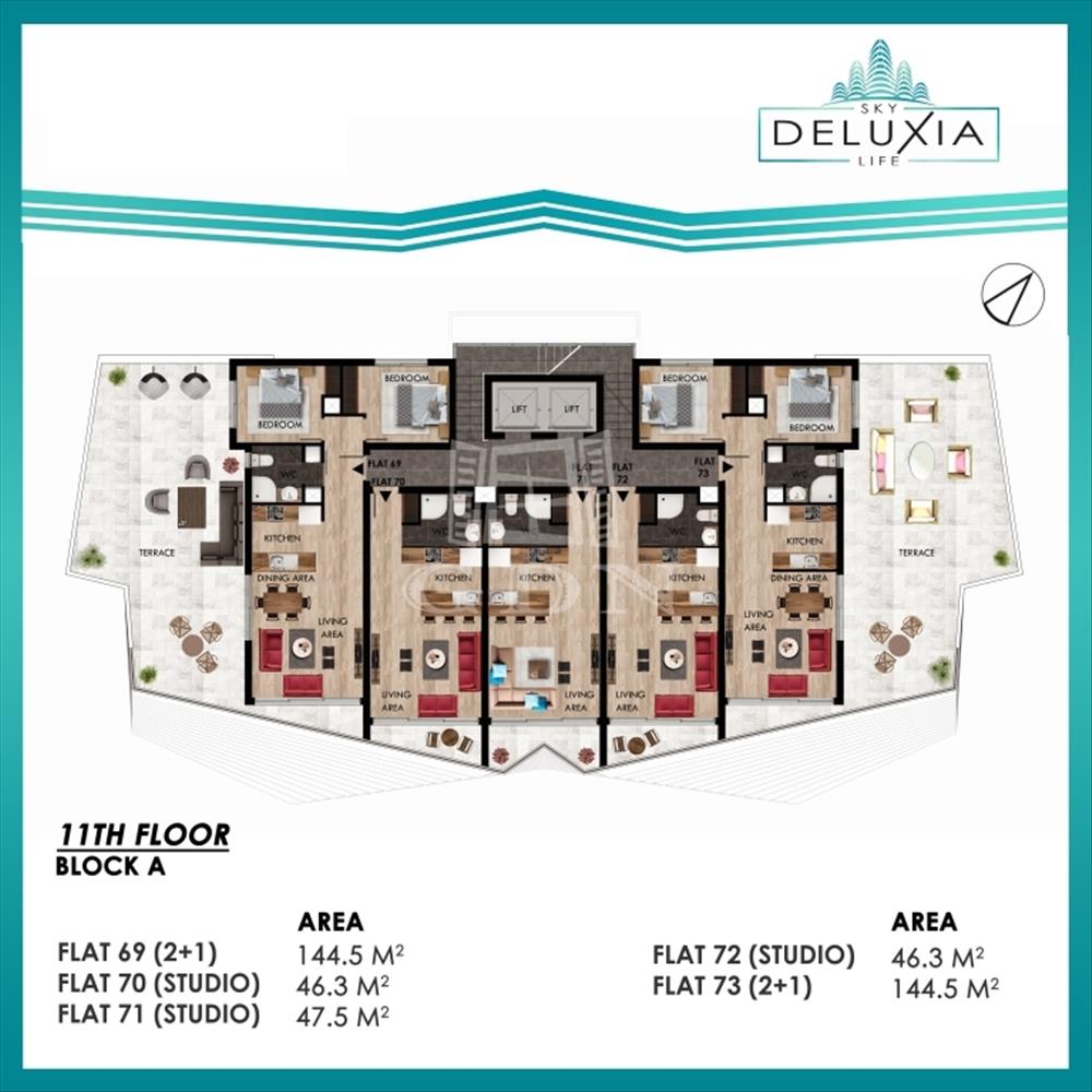 Az Iskelén épülő Sky Deluxia Life projekt keretein belül kínáljuk megvásárlásra, ezt az 'a' épületben található 11. emeleti bruttó 145 nm-es, Nappali+2 hálószobás, nagy méretű erkéllyel rendelkező lakást, amely mind saját használatra, mind bérbeadásra / befektetésre kiváló lehetőség. ( Az alaprajzon flat 73 lakás)