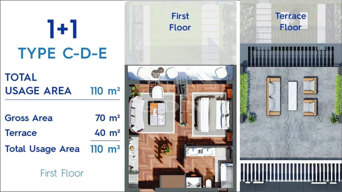 The Seafront Iskele project, located on a total plot of 29, 750 sqm, consists of 7 building blocks comprising 24 studio apartments of 78 sqm and 32 penthouses of 74 sqm, 20 living + 1 bedroom apartments of 105 sqm and 20 penthouses of 110 sqm, 24 penthouses of 125 sqm and 32 penthouses of 115 sqm.