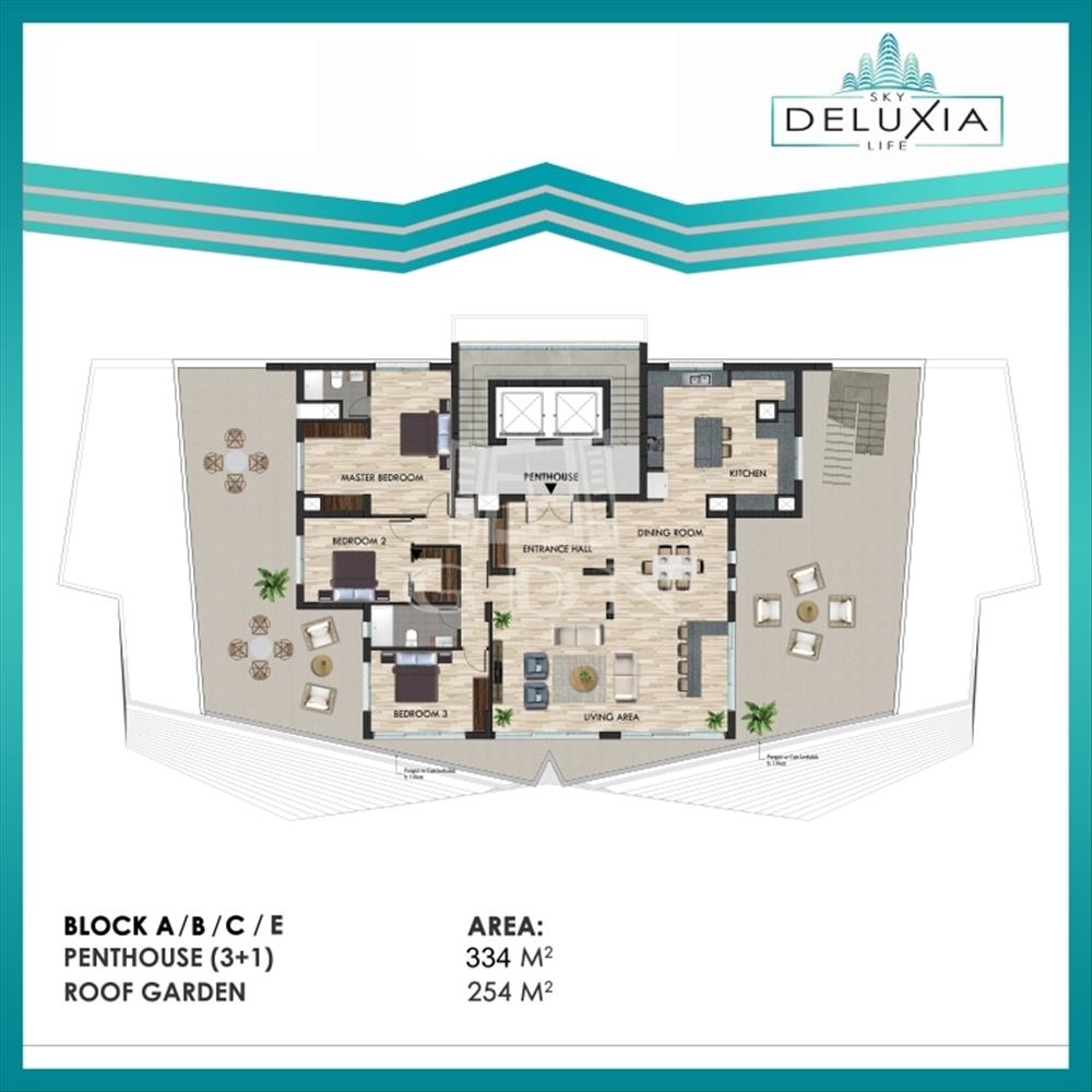 Az Iskelén épülő Sky Deluxia Life projekt keretein belül kínáljuk megvásárlásra, ezt a 'c' épület legfelső 12. emeletén található, bruttó 334 nm-es, Nappali+3 hálószobás luxus penthouse lakást, hatalmas 254 nm alapterületű körpanorámás, medencés tetőterasszal, amely mind saját használatra, mind bérbeadásra / befektetésre kiváló lehetőség.