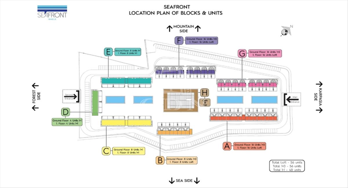 A tengerparti Seafront Iskele projekt összesen 29 750 m²-es telken található 7db épületblokkban 24 db 78 m²-es és 32 db 74 m²-es stúdióból, 20 db 105 m²-es és 20 db 110 m²-es nappali + 1 hálószobás lakásból és 24 db 125 m²-es illetve 32 db 115 m²-es loft lakásból áll.