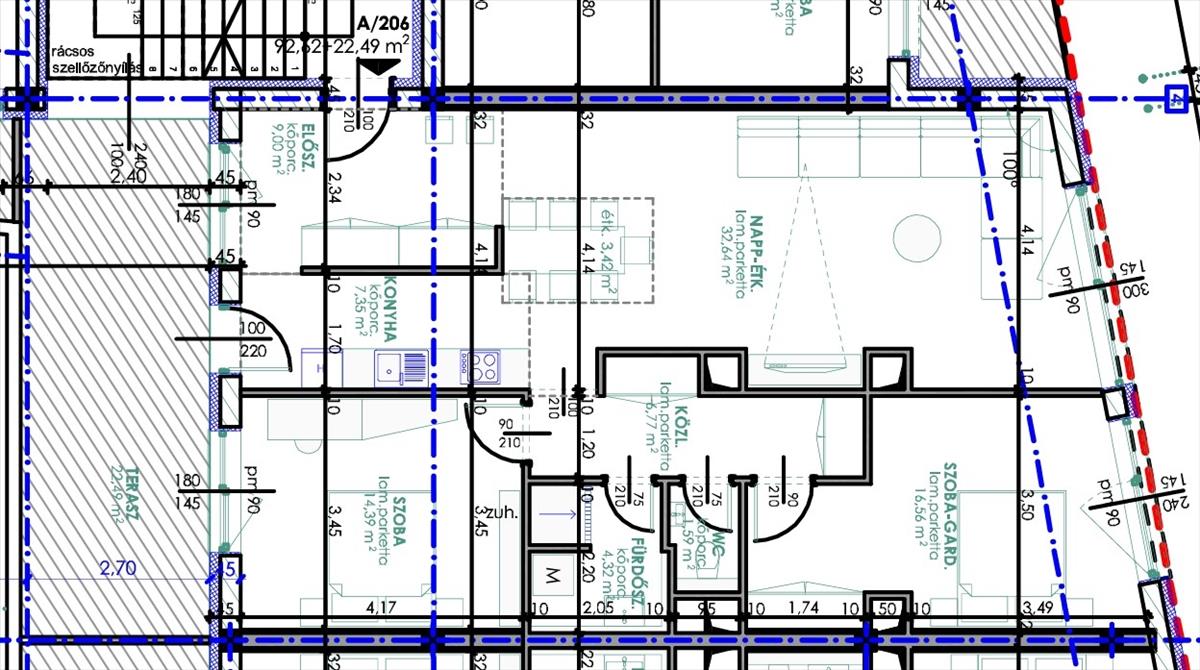 BURKOLATOK: a hidegpadlós helyiségekben kerámia burkolólap, a melegpadlós helyiségekben laminált parketta. a fürdőszobában és a WC-ben 2, 00 m magasságig körben csempeburkolat.