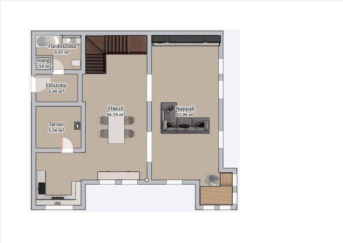 Helyiségei: nappali, étkező, konyha, kamra, fürdőszoba, előszoba, lépcső