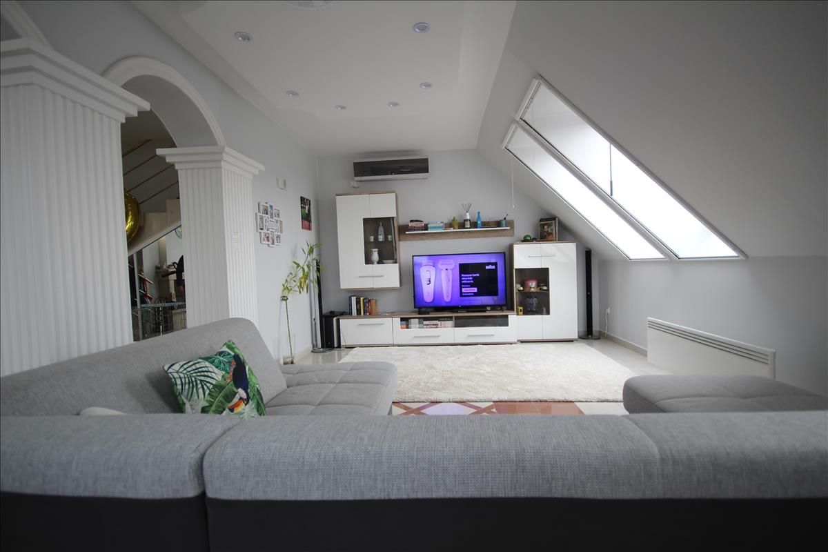 A tetőtér beépítése kifejezetten egyedi elgondolású. Hosszú világos folyosójára számtalan ablakon árad a fény.