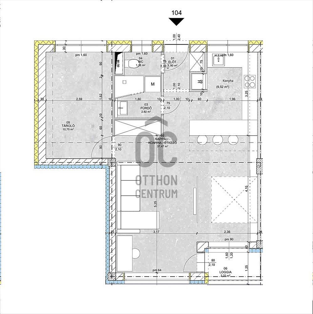 Ez az 1. emeleti lakás 54, 32nm-es, nappali-étkező konyha +1 szobás, 2, 22 nm-es loggiával.