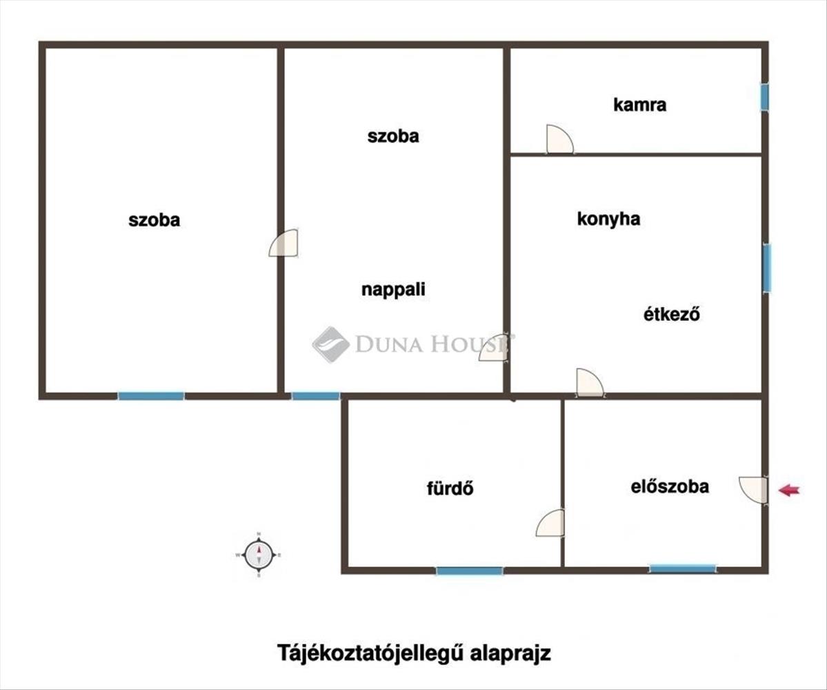 Helyiségei: szoba, nappali- szoba, konyha - étkező, fürdőszoba - wc, előszoba, kamra, tároló