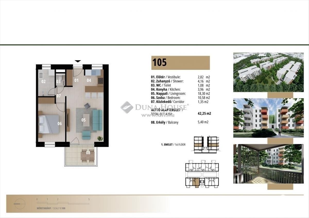 A projektben 43 nm-es, nappali + 1 szobás, NY-i tájolású lakás 6 nm-es erkéllyel eladó