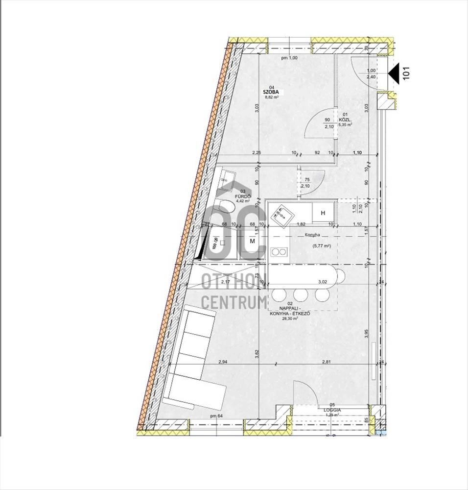 Ez az 1. emeleti lakás 46, 89 nm-es, nappali-étkező konyha +1 szobás, 1, 29 nm-es erkéllyel.