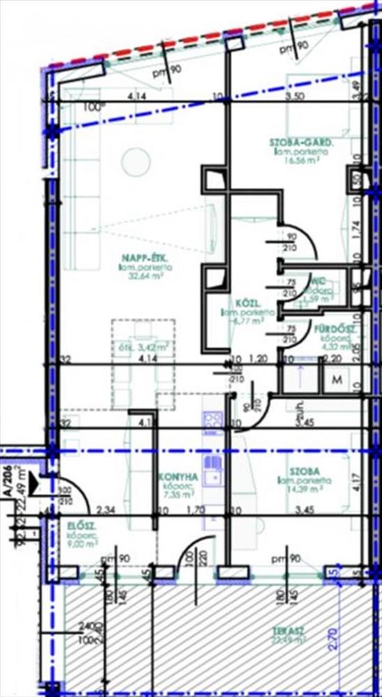 Ez a lakás 92, 62 nm-es, és egy déli fekvésű 22, 49 nm-es terasszal rendelkezik. Kialakítása: amerikai konyhás nappali, külön konyharész, 2 hálószoba, gardrób, fürdőszoba és külön wc.