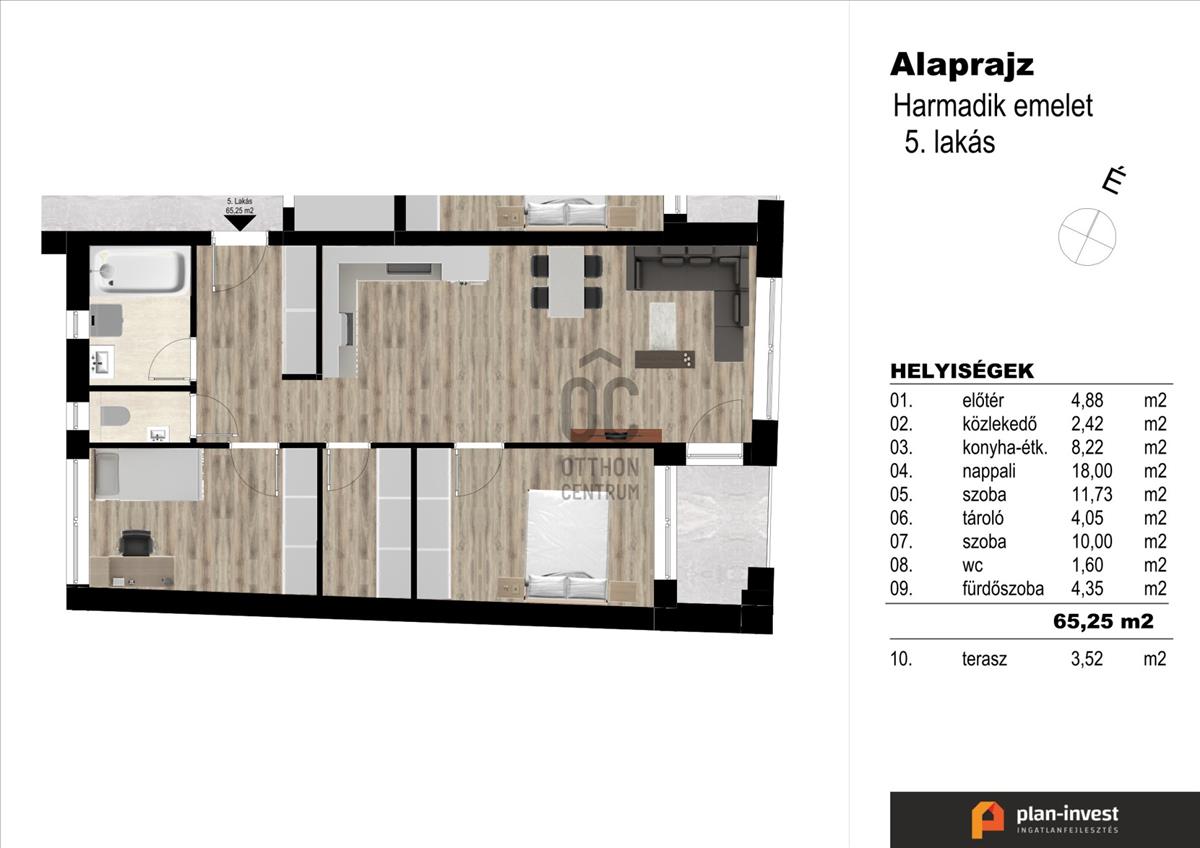 Helyiségei : konyha - étkező - nappali + 2 szoba + fürdő + külön wc
