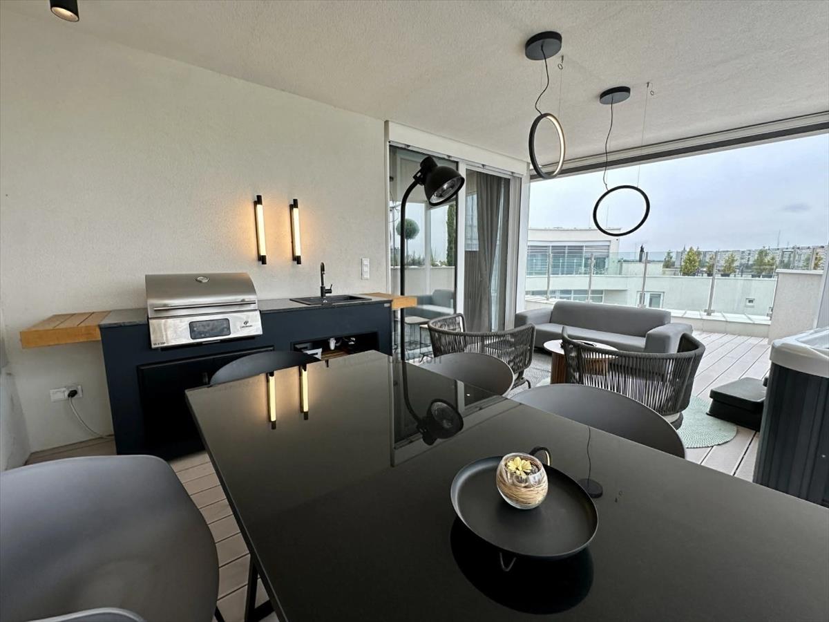 - a tetőteraszon egy fedett, árnyékos pihenőrész került kialakításra, ahol helyet kapott egy nagyméretű jakuzzi. Egy grillkonyha, egy óriás led tv, kényelmes pihenősarok