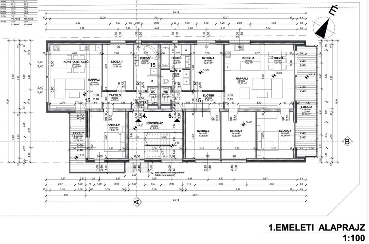 Elosztás: nappali + konyha-étkező, 2 külön nyíló hálószoba, fürdő, külön wc, előtér, tároló és terasz.
