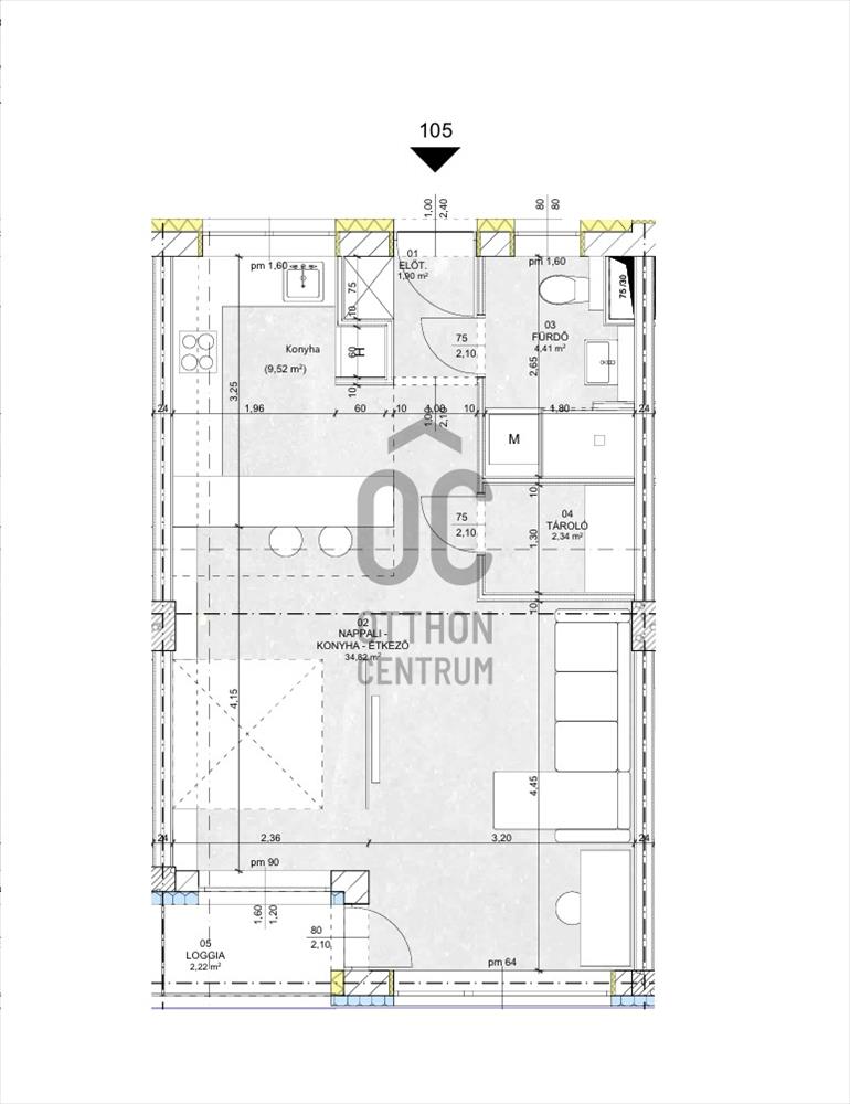 Ez az 1. emeleti lakás 43, 47 nm-es, nappali-étkező-konyhás, 2, 22 nm-es loggiával.