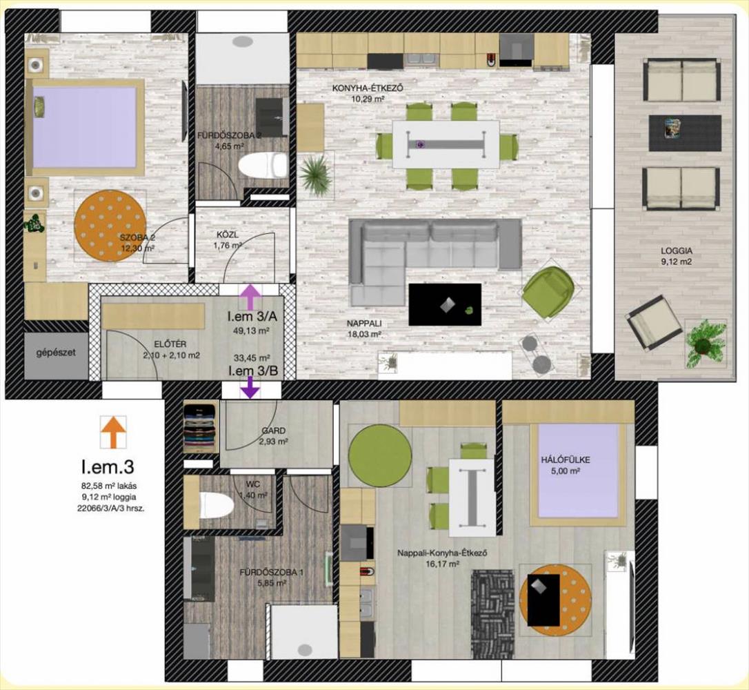 Debrecen egyik kedvelt részén, a Lóverseny Residence exkluzív, kis lakásszámú társasházában kínálunk megvételre egy i. emeleti, 82, 58 m²-es, nappali + 2 szobás lakást, amelyhez 9, 12 m²-es loggia kapcsolódik. a lakás belső udvari tájolású, csendes, harmonikus életteret kínál, miközben a déli és keleti fekvésnek köszönhetően egész nap világos, napfényes marad.