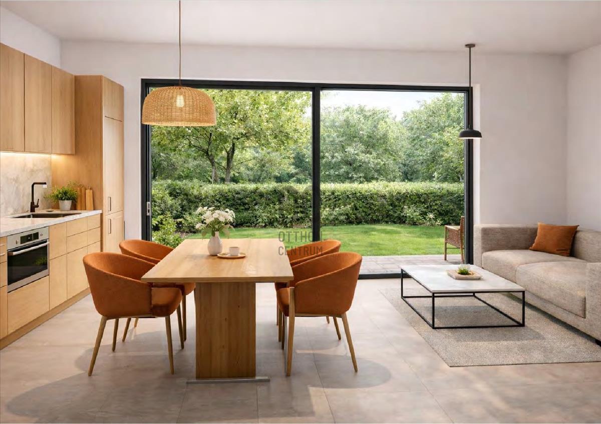 A földszinti lakások egyedi arculata a tágas nappali, melyet a teraszra nyíló hatalmas hőszigetelt nagy ablak borítja, így a természet mindig karnyújtásnyira van.