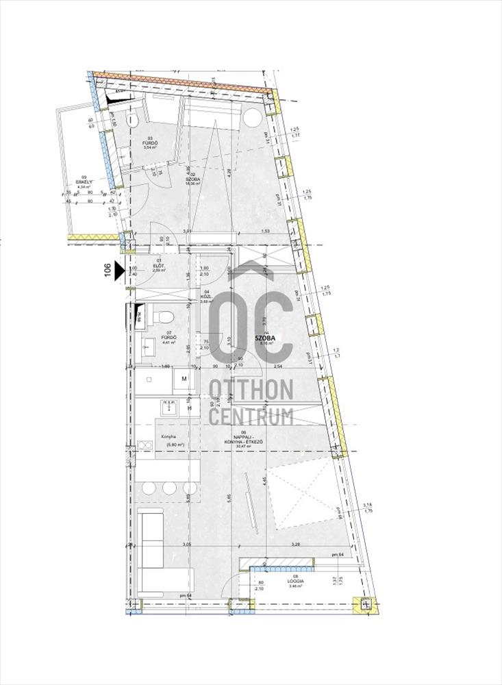 Ez az 1. emeleti lakás 68, 96 nm-es, nappali-étkező konyha +2 szobás, 2 fürdőszobás, 3, 46 nm-es loggiával és 4, 34 nm-es erkéllyel.