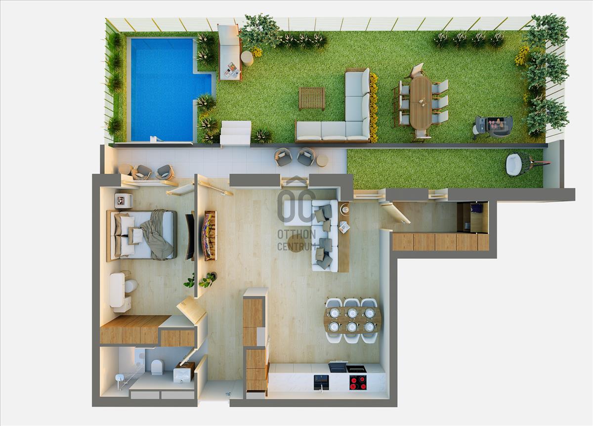 Ez a földszinti kertkapcsolatos lakás 62, 45 nm-es, nappali-étkező-konyha +1 szobás, 8, 8 nm-es terasszal és 67 nm-es kerttel.