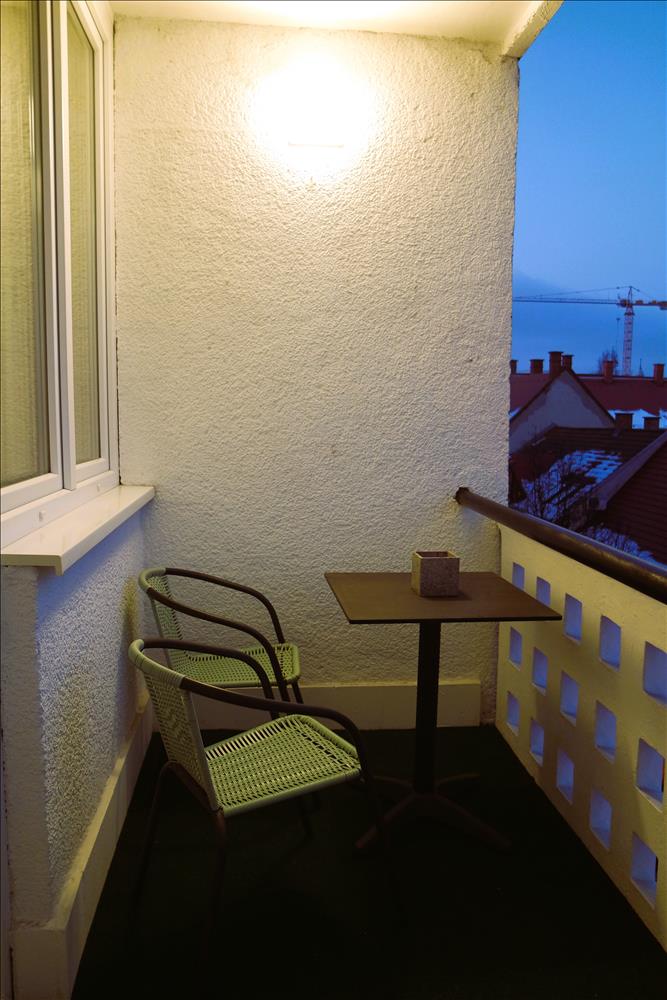 Az erkély a csendes, forgalomtól mentes setáló utcára néz, panorámás kilátással rendelkezik.
