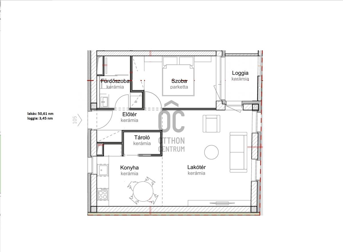 Ez az 1. emeleti lakás 50, 74 nm-es, nappali-étkező-konyha +1 szobás, 3, 68 nm-es loggiával. Nappali+ 2 szobássá alakítható.