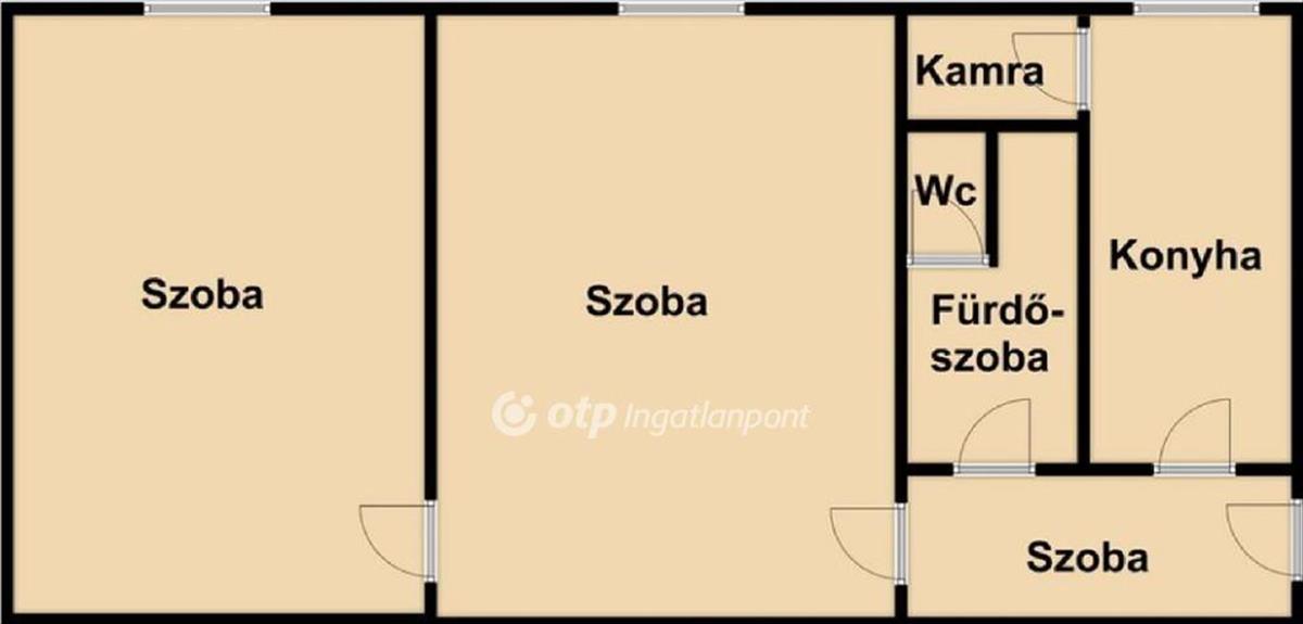 Elosztása: nappali + 1 szoba, előszoba, étkező-konyha, zuhanyzós fürdőszoba, wc és kamra.