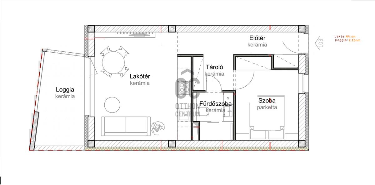 Ez az 1. emeleti, nappali-étkező-konyha +1 szobás lakás 44 nm-es +7, 15 nm-es loggiával.