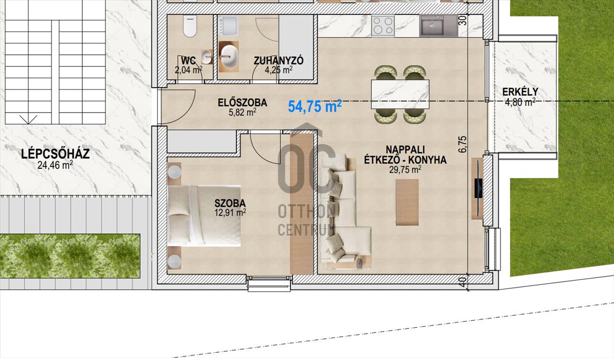 Az ingatlan az 1. emeleten helyezkedik el, 54, 75 m2 alapterületű + 4, 8 m2 erkély tartozik hozzá.Projekt bemutatása