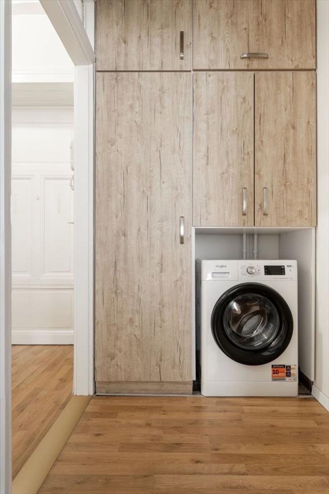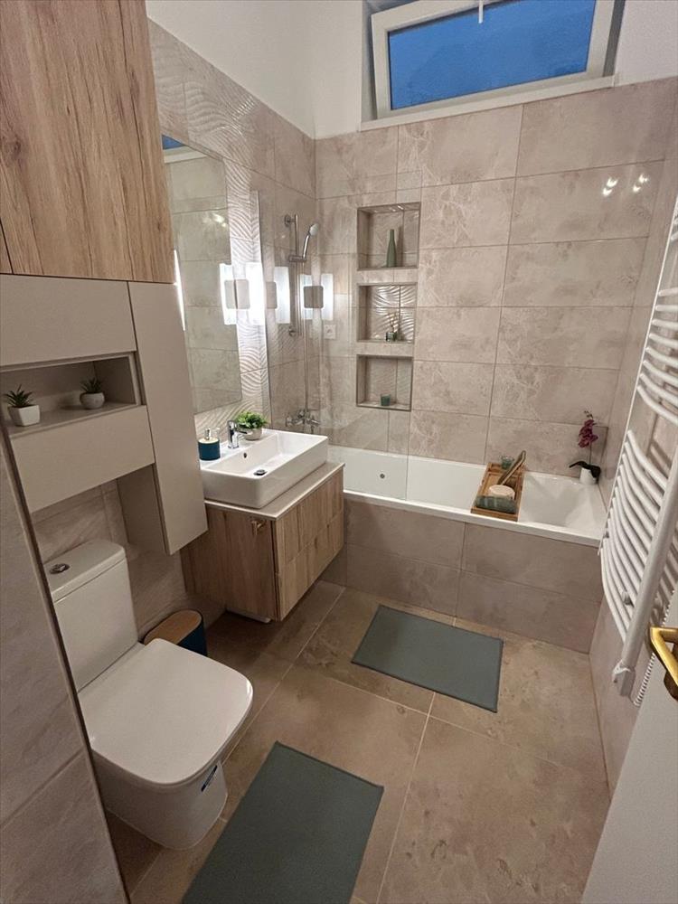 - a kádas kialakítású, fali törölközőszárítóval ellátott fürdőszoba és a wc egy légtérben találhatóak, a mosógép külön helyiségben (előszoba) került elhelyezésre