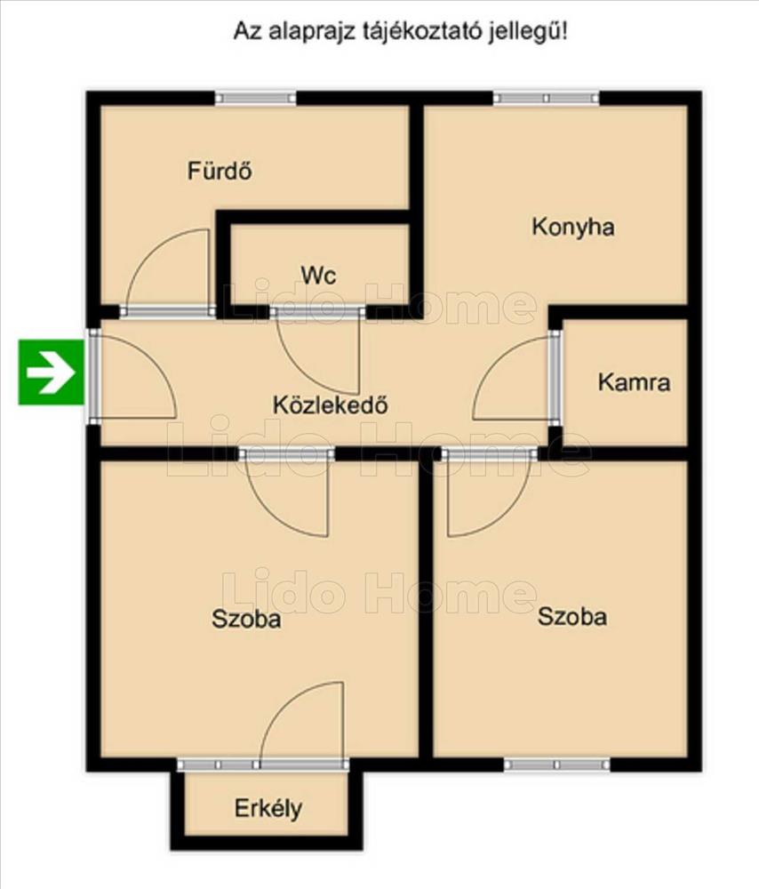 A lakás praktikus elrendezésű: belépve egy tágas közlekedő fogad, ahonnan jobbra egy világos, erkélykapcsolatos nappali nyílik. Bal oldalon található a fürdőszoba, mellette külön helyiségben a wc. a közlekedőn tovább haladva jobbra egy kényelmes méretű hálószoba helyezkedik el, balra pedig a konyha étkezővel, melyhez kamra is tartozik.