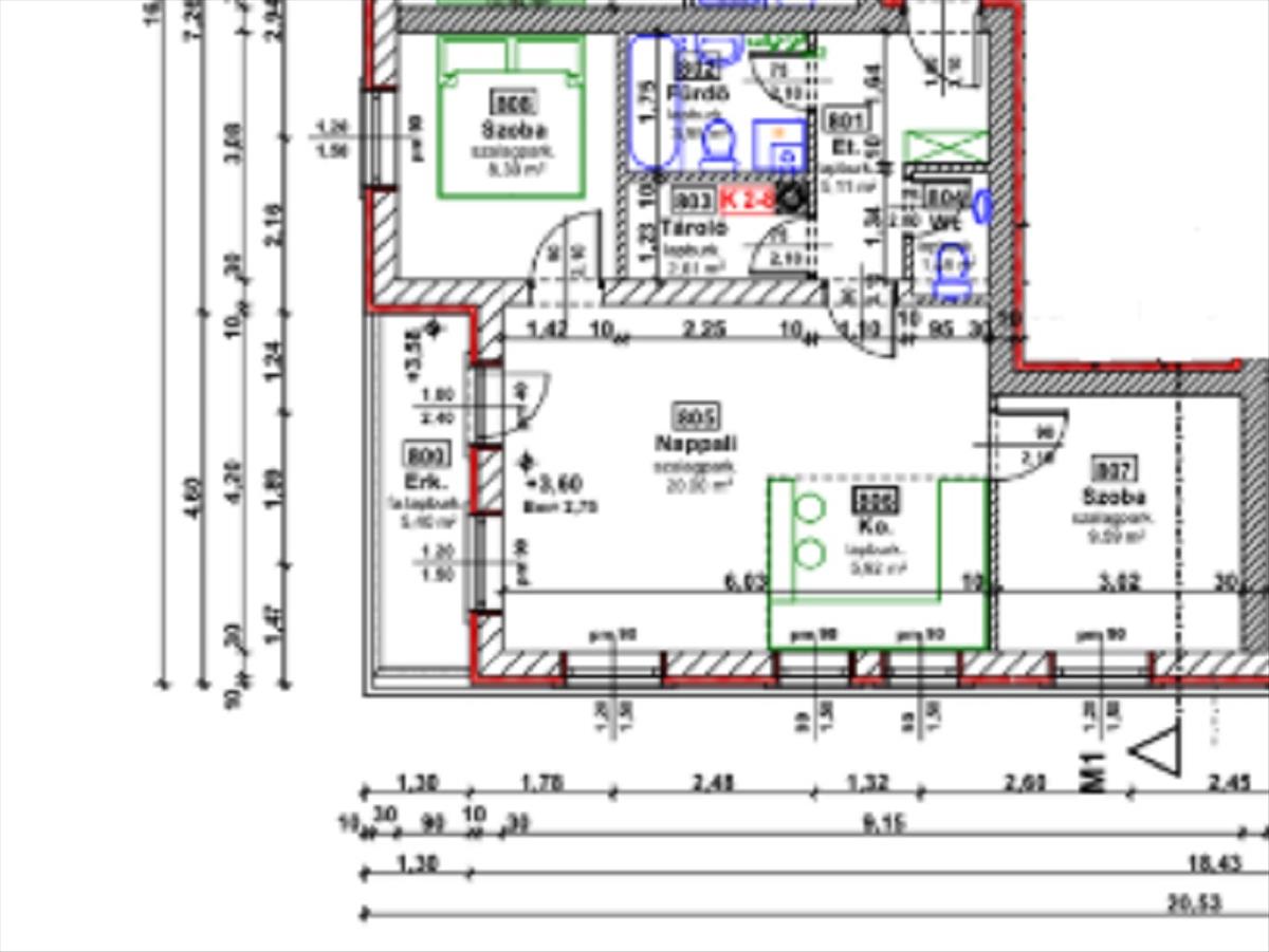 8, Lakás nettó 57, 05 m2, + 5, 4 m2 erkély, nappali + 2 háló, fan-coil klíma (a hálószobákban kiállás előkészítés), riasztó, kaputelefon, 2db parkoló
