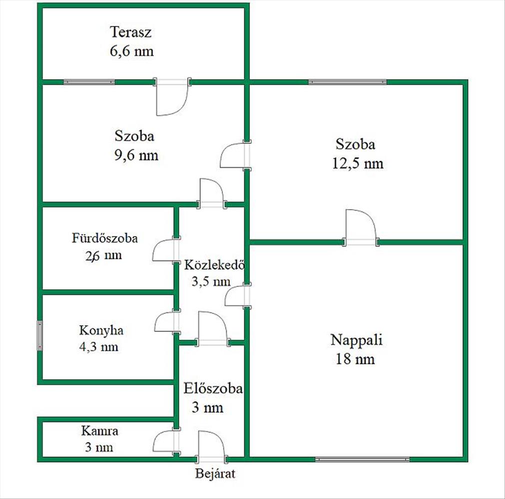 A lakás helyiségei: előszoba, kamra, nappali, 2 db hálószoba, konyha és fürdőszoba.